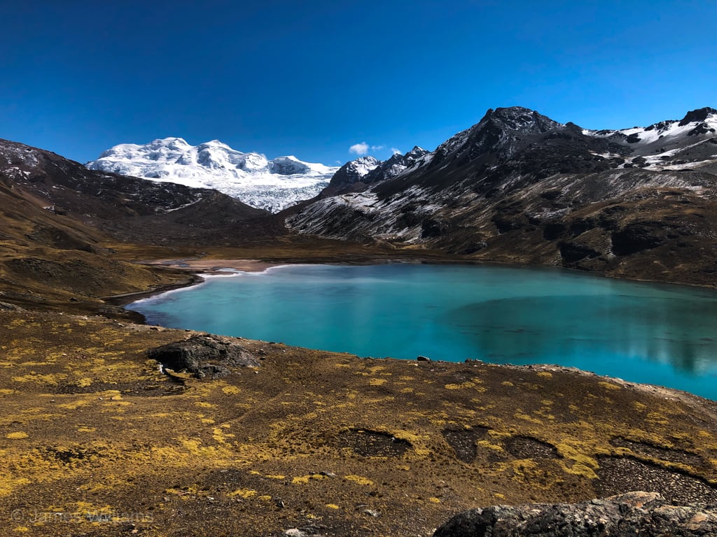 A glaciated peak overlooking Sibinacocha in the Andes.